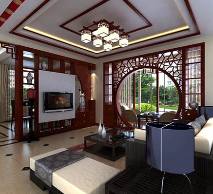 是以中國傳統(tǒng)文化作為背景,在色彩搭配上以黑、紅、為主,室內(nèi)多采用對稱式的布局方式,格調(diào)高雅,造型簡樸優(yōu)美,色彩濃重而成熟。